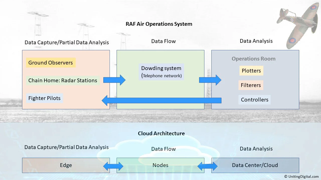 One of the main reasons that kept the UK from taking over by Nazi Germany and survived the relentless bombing was because of its sophisticated Air Operation System. To my surprise, it has a similar cloud and edge computing architecture in terms of data flow layers. In the edge computing infrastructure, we have the IoT devices at the edge of the network, collecting various data through sensors, and it could provide additional services after processing the data onsite and passes back the information to the centralized cloud.