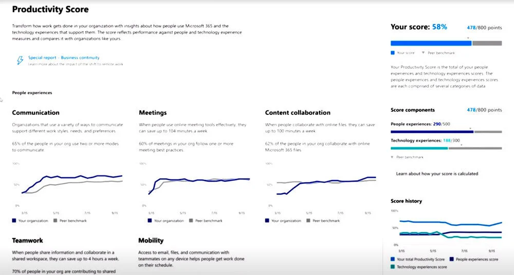 Inside the Microsoft 365 admin center, there is a dashboard page that summarizes an organization's productivity by measuring various metrics and displaying them in a Productivity Score. The purpose of the Productivity Score is to give insights into how people experience technology and related experiences. With these experiences, they are further grouped into several categories, such as