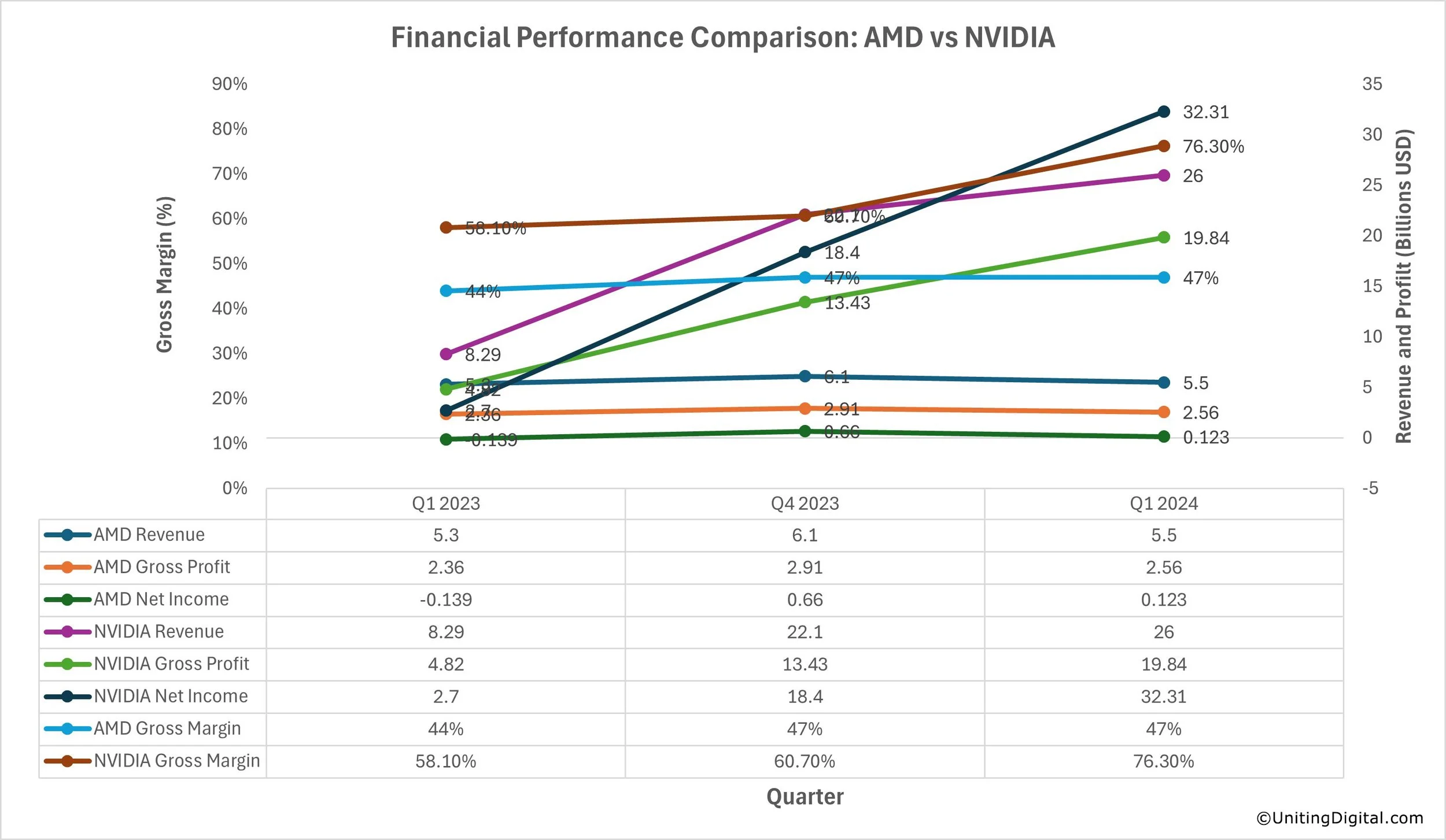 Both AMD and NVIDIA have demonstrated significant financial performance. Still, NVIDIA's financial strength shows impressive revenue growth and gross margins, reflecting its dominant market position, especially driven by its AI products and data center solutions. Additionally, NVIDIA consistently maintains higher gross margins than AMD, reflecting its strong pricing power and efficient cost management. From a financial performance perspective, NVIDIA's net income shows its profitability, significantly outperforming AMD.