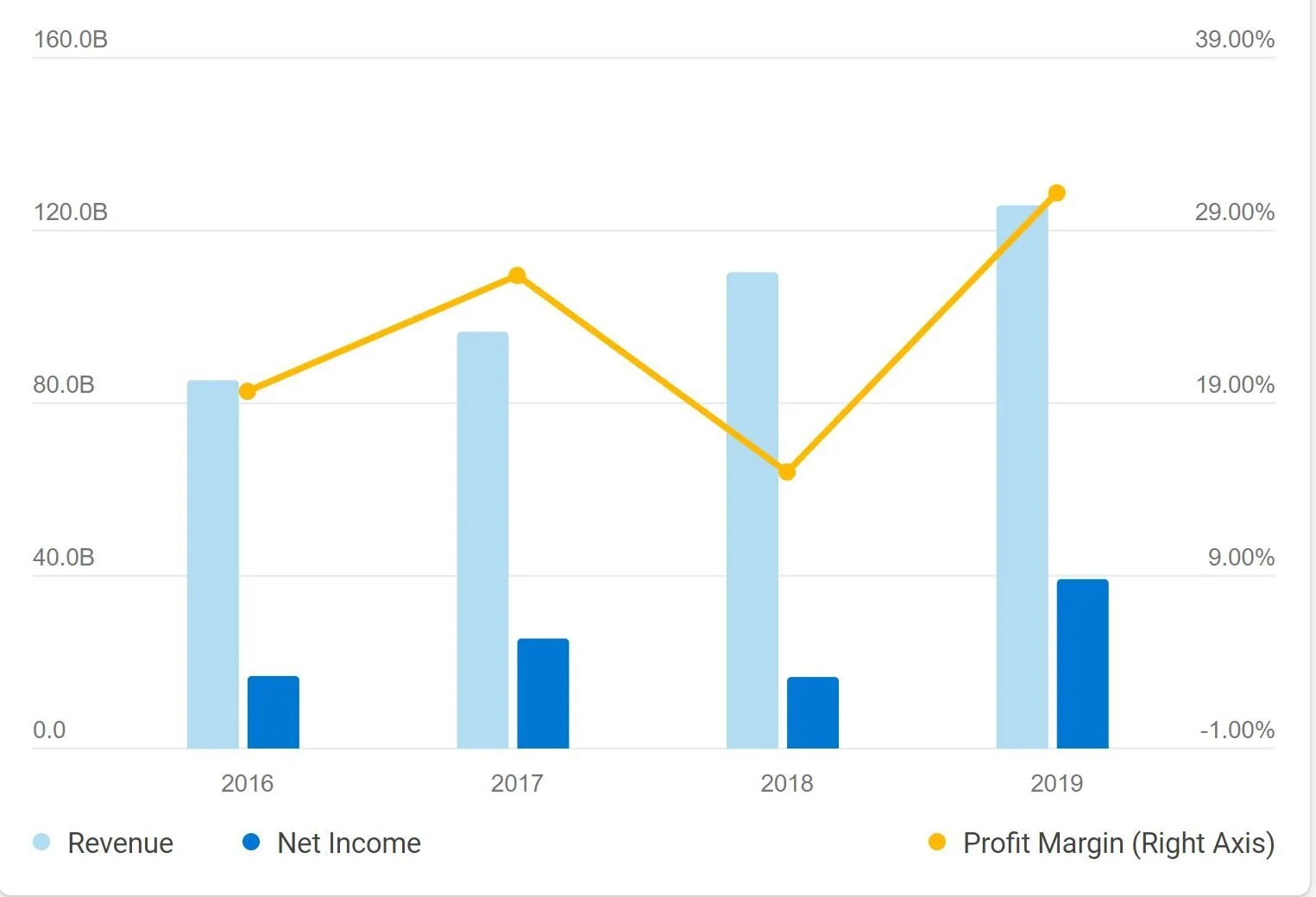 From the annual income reports, Microsoft reported revenue of 125.8B for FY 2019, an increase of 47.50% compared to FY 2016. Net income grew 133.60% to 39.2B.