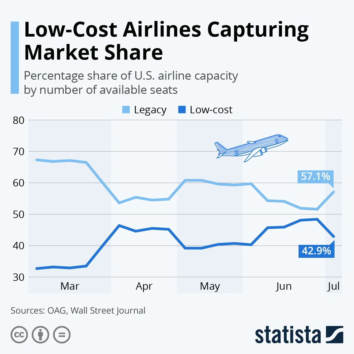 This chart shows the U.S. share of airline capacity by number of available seats (in millions).